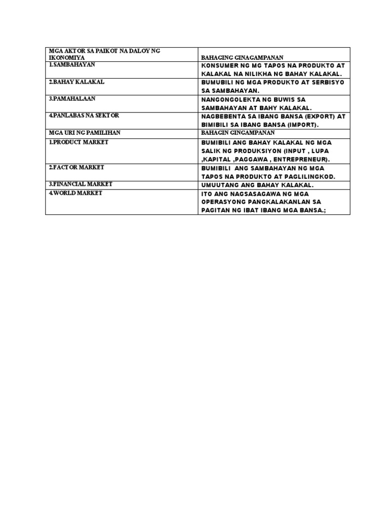 Hindi lamang ang mga bahagi ng paikot na modelo ng ekonomiya ang may mahalagang gampanin sa ekonomiya ng bansa. Sila ay binubuo ng ibat ibang aktor sa puntong ito masasabing magkaiba ang sambahayan at bahay kalakalMayroong dalawang uri ng pamilihan una pamilihan ng mga salik ng produksiyon o factor markets kabilang dito ang pamilihan para sa kapital na produktolupa at paggawa ikalawang uri ay pamilihan ng mga tapos na produkto o commoditySa paggamit ng kapital na produkto kailangang magbayad ng.