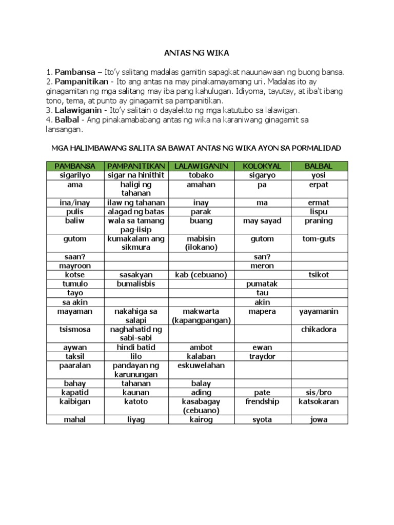 9262017 NARITO ANG MGA HALIMBAWA NG IBAT IBANG ANTAS NG WIKA. Nagtataglay ng kagaspangan ang mga salitang ito subalit maaari rin namang maging repinado batay sa kung sino ang nagsasalita gayon din sa kanyang kinakausap. Ang ibig sabihin ng nagbabantulot ay ayaw at nag-aalangan.