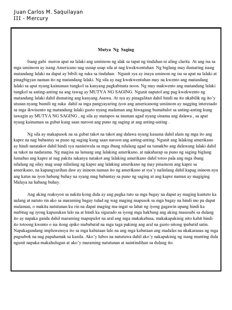 Salungat sa inaasahan palaging magkagalit at nag-aaway ang kambal dahilan upang mamroblema ang kanilang mga magulang. Bumalik sa Espanya si Makaraig habang si Tadeo naman ay masayang di na siya mag-aaral. ANG ALAMAT NG SAGING Noong unang panahon sa isang nayon ay may magkasintahan.