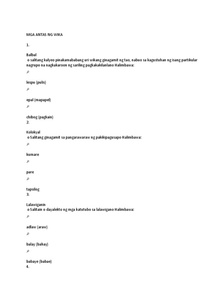 Tinatawag din itong singaw ng panahon sapagkat bawat panahon ay may nabubuong mga salita. MGA ANTAS NG WIKA 1Ang BALBAL o islang ay ang di-pamantayang paggamit ng mga salita sa isang wika ng isang partikular na grupo ng lipunan. Paggamit ng Bilang Halimbawa.